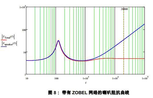 以第3節(jié)的喇叭參數(shù)為例計(jì)算得出和。圖8是加入ZOBEL網(wǎng)絡(luò)前后的喇叭阻抗曲線對(duì)比?梢奪OBEL網(wǎng)絡(luò)的作用很明顯,將高頻部分的阻抗提升壓制下來(lái),保持在附近。這樣就能限制LC濾波網(wǎng)絡(luò)的截止頻率附近的Q值。從而不會(huì)產(chǎn)生高次諧波的過流保護(hù)問題。