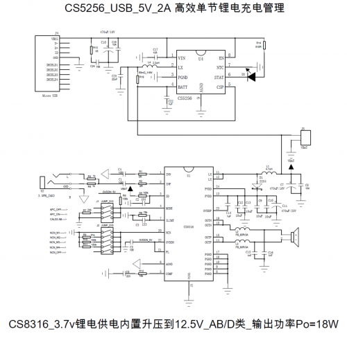 CS8316+CS5082組成5V USB輸入、雙節(jié)鋰電池串聯(lián)應(yīng)用、升壓充電實(shí)現(xiàn)25W恒定功率輸出完整解決方案,典型原理圖如下: