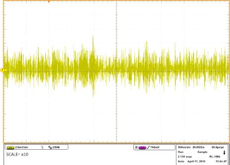 但什么是頻譜噪聲密度呢?如果您及時(shí)測(cè)量噪聲,您只能看到噪聲的絕對(duì)振幅值,但不能看到所有噪聲屬性的頻率。正如上面的圖片所示,噪聲在x10的范圍內(nèi)。頻譜噪聲密度曲線是所產(chǎn)生的噪聲之和。每一噪聲都是在窄幅的頻率范圍內(nèi)測(cè)量的。您可在下面的圖片中看到頻譜噪聲密度。