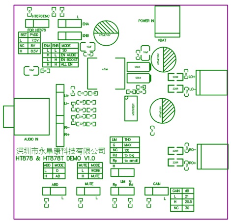 | HT878/HT878T 單節(jié)鋰電池內(nèi)置自適應(yīng)升壓AB/D類(lèi)切換8W雙聲道音頻功放解決方案 |