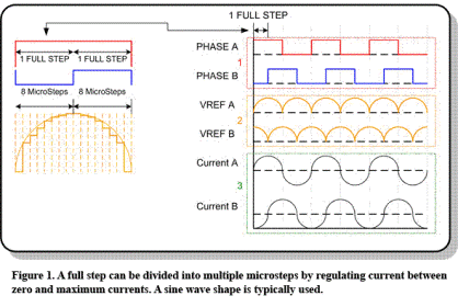圖 1 通過調(diào)節(jié)零和最大電流之間的電流,我們可以將一個全步分成多個微步。一般會使用一個正弦波形。