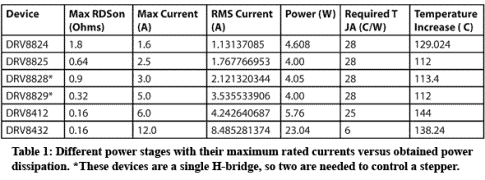 表 1 最大額定電流的不同功率級對比得到的功耗。這些器件均為單H橋,因此需要兩個來控制一個步進(jìn)馬達(dá)。