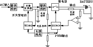本文所介紹的充電器其充電對(duì)象為24V鉛酸蓄電池,輸入電壓范圍為交流100~240V,28V輸出時(shí)額定輸出電流為4A。該充電器電路由三部分組成,主電路、PWM芯片UC3842控制電路、單片機(jī)S3C9454控制電路,整體電路結(jié)構(gòu)如圖2所示。由于該充電器功率為100W左右,故功率部分采用成本較低的單端反激電路,利用UC3842作為主電路控制IC。輸出端繼電器僅在單片機(jī)檢測(cè)符合充電條件后閉合,充電器才能對(duì)電池進(jìn)行充電。