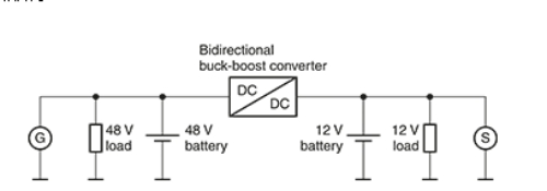 主要改進(jìn)在于將發(fā)電機(jī)的電平設(shè)置為48V等級(jí),以實(shí)現(xiàn)更高的功率輸出和能效等級(jí)。兩種電壓等級(jí)通過一個(gè)雙向降壓式轉(zhuǎn)換器裝置進(jìn)行連接。
