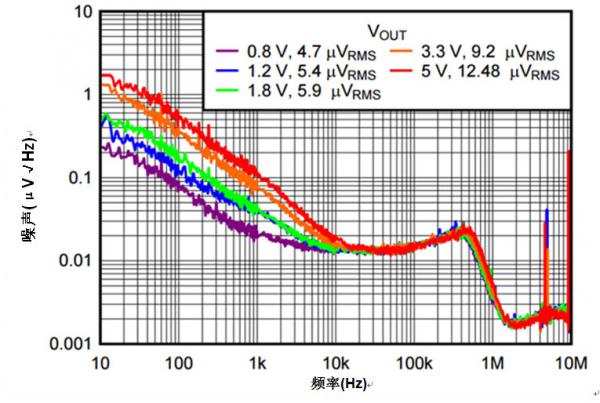 如您從各種曲線看到的那樣,輸出噪聲(以每平方根赫茲[μV/ Hz]來(lái)表示)集中在頻譜低端。該噪聲大部分出自?xún)?nèi)部參考電壓,以及誤差放大器FET和電阻分壓器。