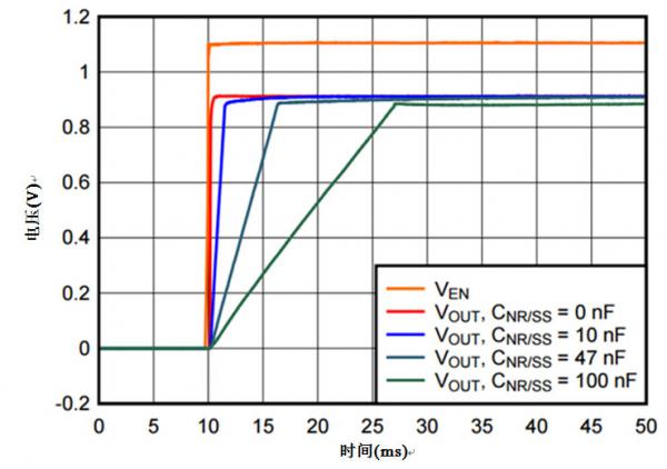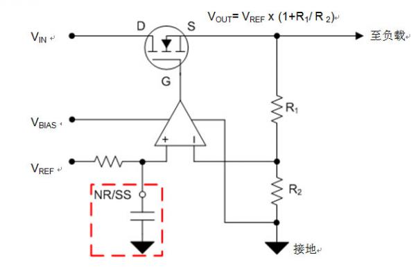 TI的許多低噪聲LDO系列都具有專(zhuān)門(mén)用作“NR/SS”的專(zhuān)用引腳,如圖 3 所示。