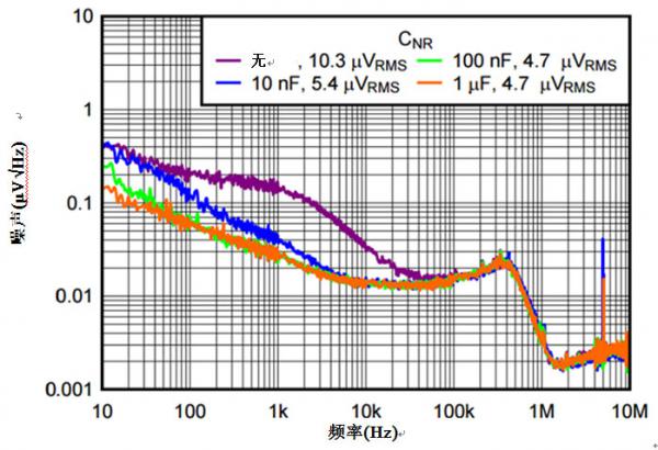 為該引腳添加一個(gè)電容器(CNR/SS),就可以形成具有內(nèi)部電阻的RC濾波器,有助于把由參考電壓生成的無(wú)用噪聲分流。由于參考電壓是噪聲的主要來(lái)源,增加電容可推送左側(cè)低通濾波器的截止頻率。圖 4 顯示了該電容器對(duì)輸出噪聲的作用結(jié)果。