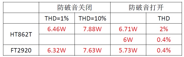 HT862T 防破音關(guān)閉輸出功率:6.46W/THD=1%;7.88W/THD=10%;