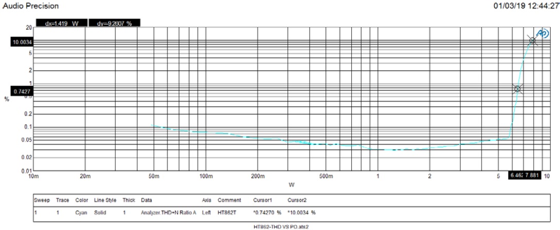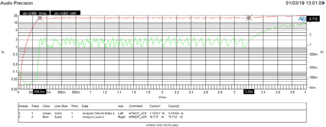 HT862T 防破音打開輸出功率:6.71W/THD=2%