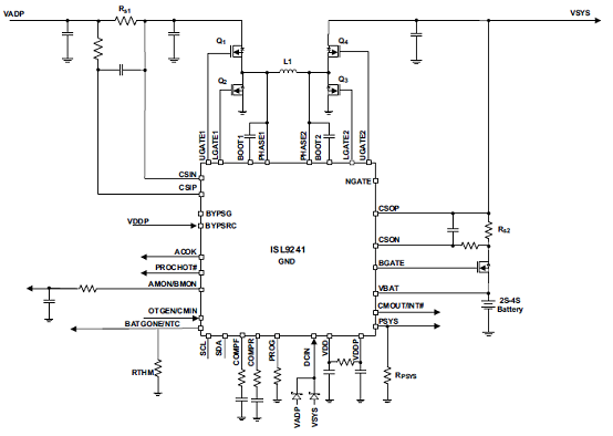 In Charge mode, the ISL9241 takes input power from a wide range (4V to 20V) of DC power sources (conventionalAC/DC charger adapters, USB PD ports, travel adapters, etc.) and safely charges battery packs with up to four cells ina series configuration.