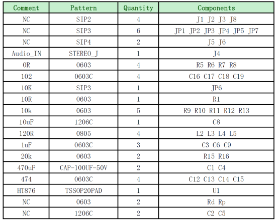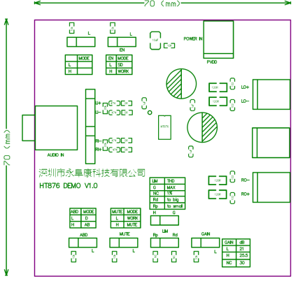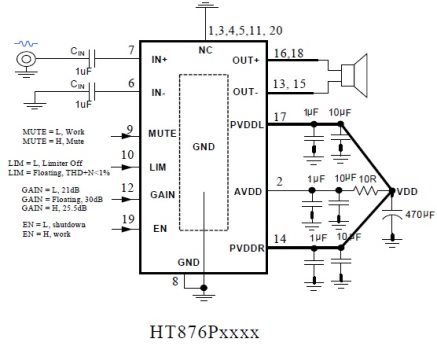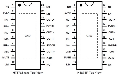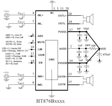 此外,HT876內(nèi)部集成免濾波器調(diào)制技術(shù),能夠直接驅(qū)動揚聲器,內(nèi)置的關(guān)斷功能使待機電流最小化,還集成了輸出端過流保護、片內(nèi)過溫保護和電源欠壓異常保護等功能。
