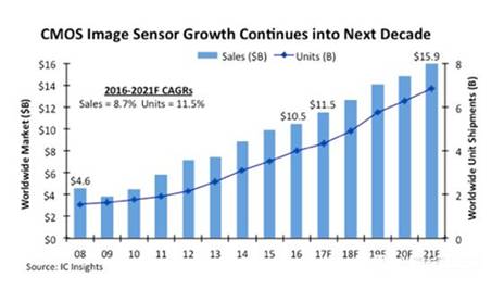 根據(jù)IC Insights 的最新數(shù)據(jù),2017年,CMOS圖像傳感器銷售額將繼續(xù)增長(zhǎng),創(chuàng)歷史最高紀(jì)錄。