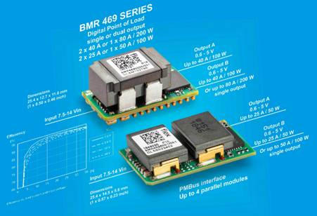 BMR4690000型號在雙輸出配置下可提供兩個(gè)獨(dú)立的40A輸出,或者在單輸出工作模式下可提供一個(gè)80A電源軌,而BMR4696001可提供2×25A輸出,或者在單輸出工作模式下可提供一個(gè)50A電源軌。用戶最多可以并聯(lián)四個(gè)模塊進(jìn)行電流共享——BMR4690000總共可提供高達(dá)320A電流,而BMR4696001則高達(dá)200A。