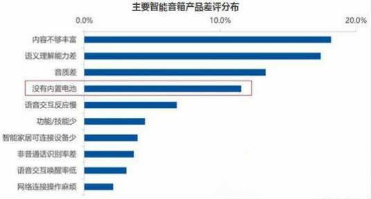 根據(jù)奧維云網(wǎng)(AVC)挖掘的主流電商平臺(tái)重點(diǎn)智能音箱品牌的消費(fèi)者評(píng)價(jià)數(shù)據(jù)顯示,不帶電池的差評(píng)占比達(dá)到11.6%,排在第四位。沒有內(nèi)置電池,意味著只能插電使用,不能自由移動(dòng)及隨身攜帶,使用場景大大受到限制。從機(jī)型看,小巧的機(jī)型在沒有電池方面的差評(píng)要高于其他機(jī)型。