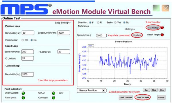 用戶只需要將MMP7xxxxx模塊與上位PC連接,然后使用鼠標(biāo)操作便可以通過MPS友好的用戶界面對控制模塊的每一個寄存器進(jìn)行讀寫操作,以及完成對控制程序的升級和燒寫。用戶還可以選定特點(diǎn)的電機(jī)輸出量后觀察將其在GUI窗口內(nèi)的實(shí)時(shí)波形進(jìn)行調(diào)試。MPS的動態(tài)GUI 可以讓實(shí)時(shí)硬件操作如同運(yùn)行仿真一般簡便。