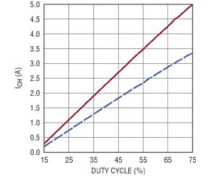 對于最大充電電流為3.3A的鋰離子電池而言,假設(shè)RMAX為511k?6?8,RIN為3.01k?6?8,最大占空比為80%,則計算可得RSENSE為0.03?6?8,RPOG為23.7k?6?8。圖2顯示了此電池的充電電流隨控制脈沖占空比而變化的功能。此外,還測試了最大充電電流為5.0A的另一款電池(RSENSE 0.02?6?8,RPOG 23.7k?6?8),請參見圖2所示充電電流隨占空比變化的圖形。