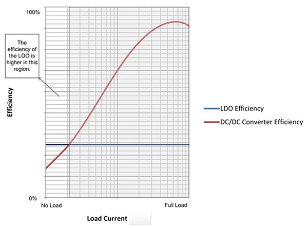 圖2給出了低IQ LDO效率曲線的一般示例,該效率曲線用DC/DC轉(zhuǎn)換器的效率曲線繪制,用于更高的電壓轉(zhuǎn)換(即12 V至1 V)。在輕負(fù)載時,LDO更有效。如果系統(tǒng)在輕負(fù)載下花費大量時間,使用LDO來調(diào)節(jié)電壓可以顯著提高系統(tǒng)總效率。