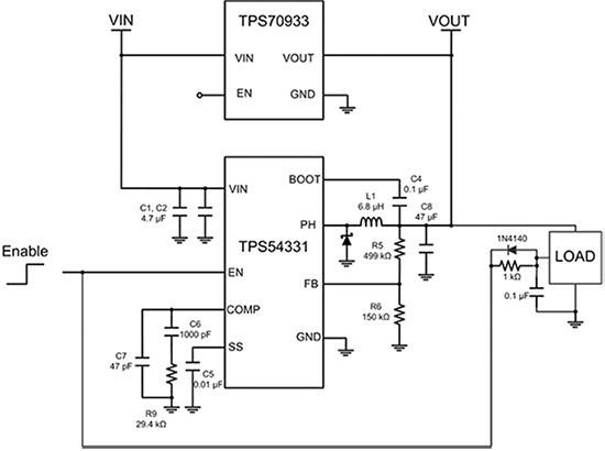 如果設(shè)計人員能夠在負(fù)載為負(fù)載時禁用DC/DC轉(zhuǎn)換器,則可以采用并行使用這兩種方法的簡單方法。最小,即對用于負(fù)載的轉(zhuǎn)換器使用相同的啟用/禁用信號。圖1中可以看到一個例子。