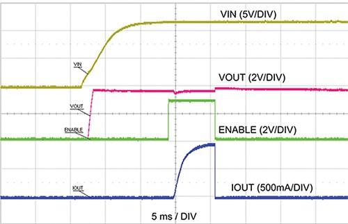 如何使用低壓差穩(wěn)壓器提高降壓轉(zhuǎn)換器的輕載效率圖6:啟動和啟用/禁用圖3中的電路。