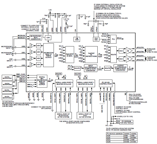 The ADAU1787 is a codec with four inputs and two outputs that incorporates two digital signal processors (DSPs). The path from the analog input to the DSP core to the analog output is optimized for low latency and is ideal for noise cancelling headsets. With the addition of just a few passive components, the ADAU1787 provides a complete headset solution.