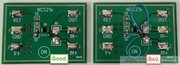 圖2:NCS213R客戶評估板:正確與錯誤的分路連接對比