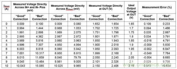 表1中的測量數(shù)據(jù)是使用圖2所示的評估板圖片測得的。使用的電流檢測放大器是NCS213R和1 mΩ并聯(lián)電阻器;電路圖參見圖3。在表1中,連接“正確”的“測量誤差(%)”列-測得輸出電壓與理想輸出電壓的測量誤差非常小,約為0.1%;同樣,直接在輸入引腳處的測量值與直接測量的并聯(lián)電阻的差值很小,最多略高于0.1%。然而,連接“錯誤”的測量表明,在1A時誤差約為1.5%,在10A時誤差超過10%。