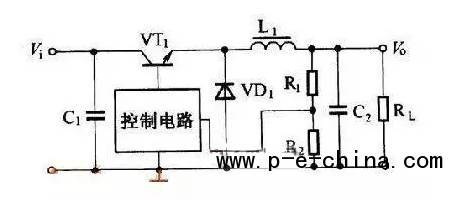 輸出的電壓Vo經(jīng)R1和 R2組成的分壓器分壓,把輸出電壓的信號(hào)反饋至控制電路,由控制電路來控制開關(guān)管的導(dǎo)通及截止時(shí)間,使輸出電壓保持不變。