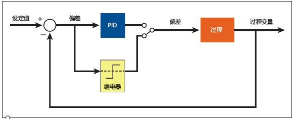 圖 1:當開關啟動時,控制器的工作方式類似于一個正常的PID控制器。當開關關閉時,控制器的作用類似于 on/off 或繼電控制器,該控制器將脈沖啟動過程以生成極限循環(huán)。每個脈沖的持續(xù)時間由過程變量在最后一個脈沖達到設定值所需的時間決定。