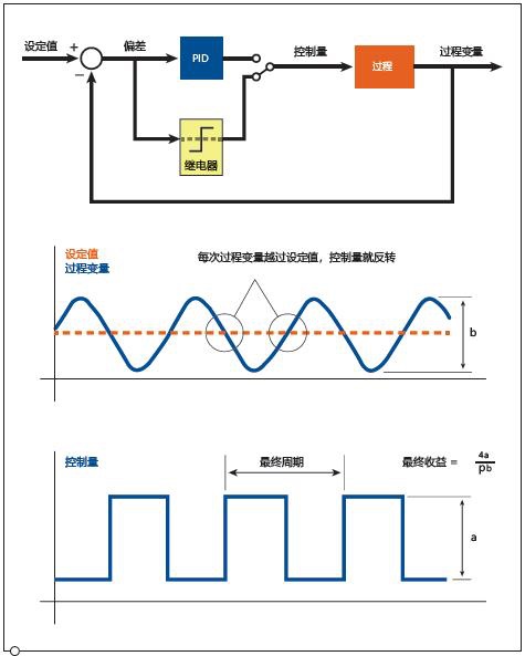 圖 2: 為了識別過程的最終周期Tu和最終增益 Pu,控制器暫時禁用其PID算法,并將其替換為on/off 繼電,強制過程變量振蕩。這兩個數(shù)字可以很好地量化過程行為,以確定如何整定PID控制器以獲得所需的閉環(huán)性能。