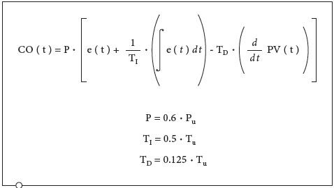 圖 3: 一旦過程行為用其最終周期Tu和極限增益Pu來量化,就可以計算出在有限振蕩條件下實現(xiàn)閉環(huán)階躍響應所需的調節(jié)參數(shù)。最上面的方程是標準的PID公式,其中 CO(t)應用于過程的控制活動,PV (t)是由回路傳感器測量的過程變量,e(t)是過程變量和設定值之間的偏差。