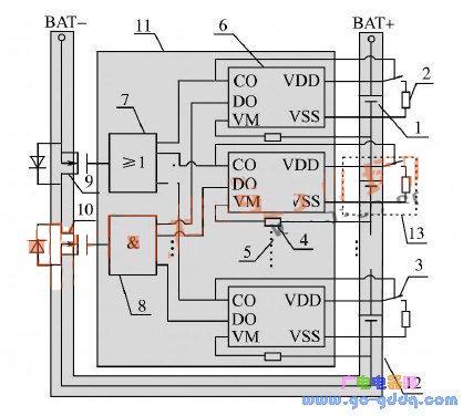 采用單節(jié)鋰電池保護(hù)芯片設(shè)計(jì)的具備均衡充電能力的鋰電池組保護(hù)板示意圖如圖1所示。其中:1為單節(jié)鋰離子電池;2為充電過(guò)電壓分流放電支路電阻;3為分流放電支路控制用開(kāi)關(guān)器件;4為過(guò)流檢測(cè)保護(hù)電阻;5為省略的鋰電池保護(hù)芯片及電路連接部分;6為單節(jié)鋰電池保護(hù)芯片(一般包括充電控制引腳CO,放電控制引腳DO,放電過(guò)電流及短路檢測(cè)引腳VM,電池正端VDD,電池負(fù)端VSS等);7為充電過(guò)電壓保護(hù)信號(hào)經(jīng)光耦隔離后形成并聯(lián)關(guān)系驅(qū)動(dòng)主電路中充電控制用MOS管柵極;8為放電欠電壓、過(guò)流、短路保護(hù)信號(hào)經(jīng)光耦隔離后形成串聯(lián)關(guān)系驅(qū)動(dòng)主電路中放電控制用MOS管柵極;9為充電控制開(kāi)關(guān)器件;10為放電控制開(kāi)關(guān)器件;11為控制電路;12為主電路;13為分流放電支路。單節(jié)鋰電池保護(hù)芯片數(shù)目依據(jù)鋰電池組電池?cái)?shù)目確定,串聯(lián)使用,分別對(duì)所對(duì)應(yīng)單節(jié)鋰電池的充放電、過(guò)流、短路狀態(tài)進(jìn)行保護(hù)。該系統(tǒng)在充電保護(hù)的同時(shí),通過(guò)保護(hù)芯片控制分流放電支路開(kāi)關(guān)器件的通斷實(shí)現(xiàn)均衡充電,該方案有別于傳統(tǒng)的在充電器端實(shí)現(xiàn)均衡充電的做法,降低了鋰電池組充電器設(shè)計(jì)應(yīng)用的成本。