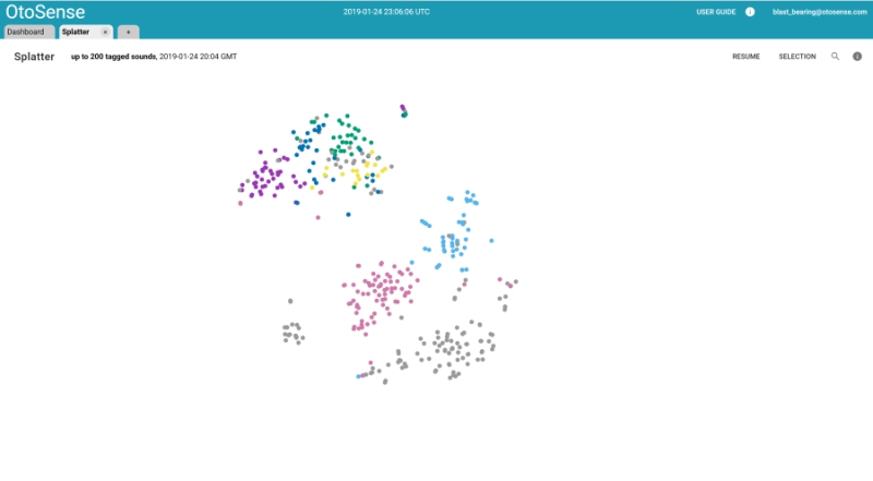OtoSense Sound Platter(也稱為 splatter)允許通過完整概述數(shù)據(jù)集來探索和標記聲音。Splatter 在完整的數(shù)據(jù)集中選擇最有趣和最具代表性的聲音,并將它們顯示為一個混合了標記和未標記聲音的 2D 相似性地圖。
