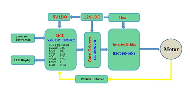 • 基于32位的ARM®Cortex™-M0內(nèi)核微控制器XMC1302-T038F032,內(nèi)置專用電機(jī)控制模塊;
