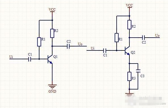 圖中所示電路中Q1發(fā)射極直接接地,Q2中發(fā)射極通過(guò)電容C3接地,因?yàn)镃3的容量較大,對(duì)交流信號(hào)的容抗很小而呈通路,這樣對(duì)交流信號(hào)而言就是發(fā)射極相當(dāng)于接地,所以這個(gè)是共發(fā)射極放大器。