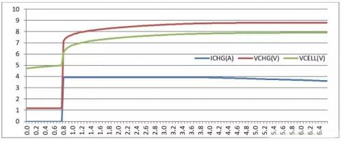 基于這個(gè)管理過程,使用充電芯片BQ24725A對一塊對講機(jī)電池(滿充電壓8.8V)進(jìn)行充電,并記錄下充電過程中的VCHG, ICHG和VCELL(電芯側(cè)的電壓)。下圖所示為基于橫坐標(biāo)的充電時(shí)間(分鐘)對應(yīng)的各個(gè)參數(shù)的變化趨勢,可以看到在不到第五分鐘,VCHG就達(dá)到最大值,ICHG就從峰值的4A電流開始下降,經(jīng)歷了從CC區(qū)間到CV區(qū)間的切換。最大充電速率的CC階段4A充電持續(xù)時(shí)間很短,可以預(yù)料,如果要對這塊電池完全充滿,CV區(qū)間將耗費(fèi)很長的時(shí)間。