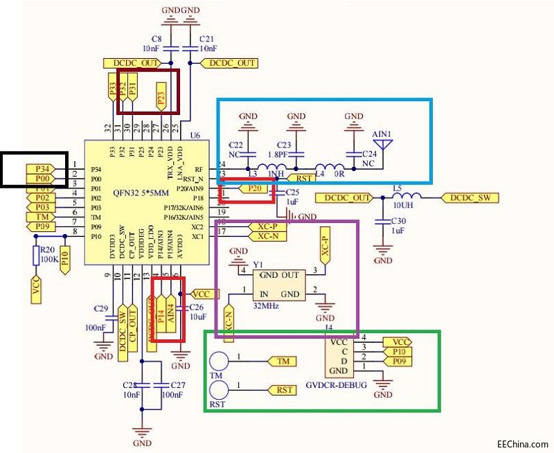 紫色:晶振,為節(jié)省成本和空間,省去了32.768khz的晶振,32M晶振供芯片主頻和RF使用。