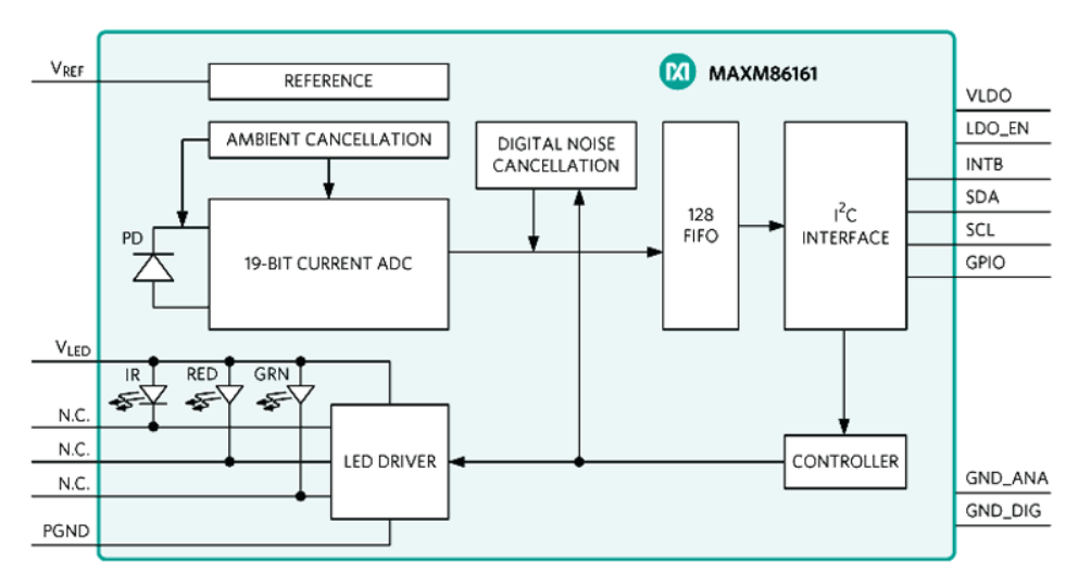 MAX86161入耳式心率監(jiān)測儀提供同類最佳的信噪比(SNR),可用于連續(xù)心率和血氧飽和度(SpO2)測量。它集成了三個可編程的高電流LED驅動器,但只需要3.0到5.5 V的單個電壓源。接收器使用帶光學讀出通道的高效PIN光電二極管。該通道具有低噪聲信號調(diào)理模擬前端(AFE),由19位ADC和環(huán)境光消除(ALC)電路組成,支持柵欄檢測和替換算法。