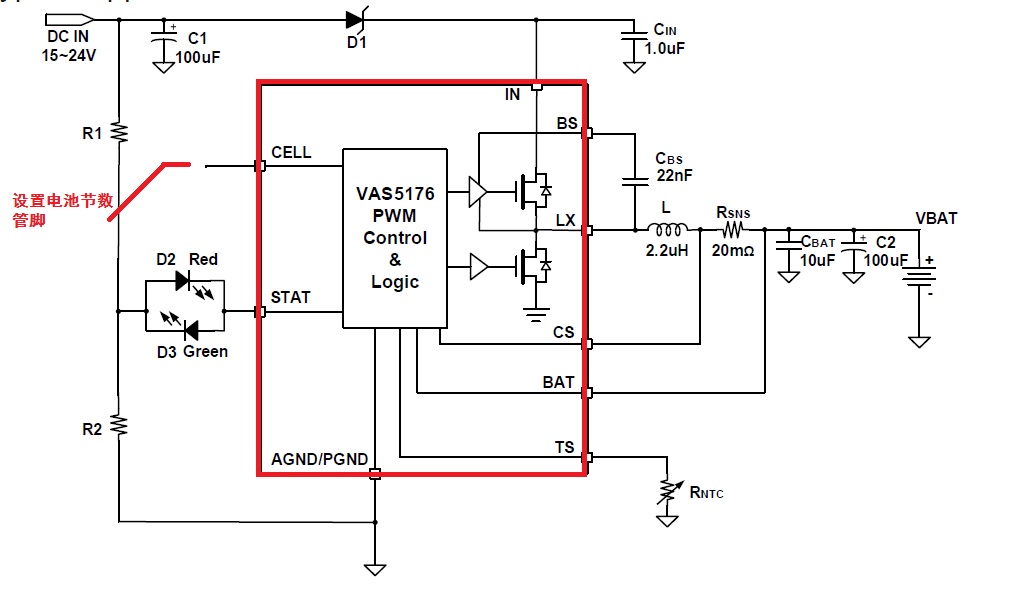 VAS5176 是一款8.5V-24V 輸入,高度集成的開關(guān)型鋰離子/聚合物電池充電芯片, 以高精度調(diào)節(jié)2A充電電流,和電池電壓。它密切監(jiān)測(cè)電池組的溫度只在設(shè)置安全溫度范圍下允許充電,還提供電池檢測(cè)、預(yù)充電調(diào)節(jié)、充電飽充和充電狀態(tài)指示等功能。熱反饋調(diào)節(jié)可降低充電電流并維持芯片內(nèi)部溫度以不超過125°C 的條件下工作,如果結(jié)溫超過155°C,它將進(jìn)行過熱關(guān)斷保護(hù),停止工作以確?煽慷。