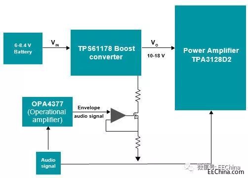 為了提高效率,您也可以根據(jù)內(nèi)容動態(tài)調(diào)整放大器的輸出電源電壓。這種技術(shù)稱為包絡(luò)跟蹤。它僅在音樂 需要提高功率時跟蹤音頻內(nèi)容并提高電壓(輸出功 率),特別是在重低音部分(信號內(nèi)容中有許多峰值)。