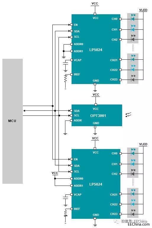 如圖 6 所示,各種LED 環(huán)形燈照明圖案參考設(shè)計說明了如何使用裝有集成式LED 引擎的新型多通道RGB LED 驅(qū)動器設(shè)計多色RGB LED 環(huán)形燈圖形子系統(tǒng)。使用環(huán)境光傳感器 IC 可自動控制LED 亮度。