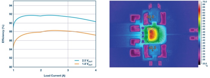 圖2.效率曲線(左)和熱圖像(右)。條件:VIN = 5 V,自然對流。
