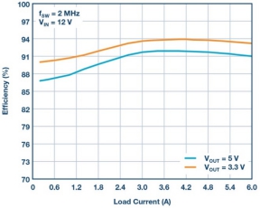 LTC3636穩(wěn)壓器具有低靜態(tài)電流,可在輸出電壓高達(dá)5 V時(shí)實(shí)現(xiàn)高效率。而LT3636-1型號將VOUT范圍擴(kuò)大至12 V。該降壓穩(wěn)壓器能夠在3.1 V至20 V的輸入電壓范圍內(nèi)工作,同時(shí)每通道提供高達(dá)6 A的輸出電流。圖3顯示的是一個(gè)高效率解決方案,而圖4顯示,其測得的效率在整個(gè)工作范圍內(nèi)一直很高。