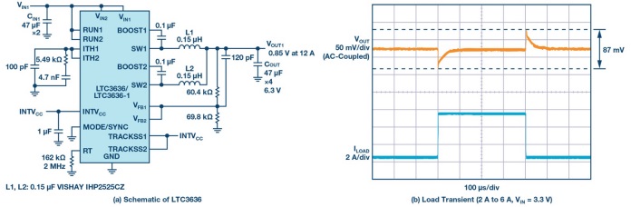 先進(jìn)的SoC和FPGA電子系統(tǒng)在汽車、交通和工業(yè)應(yīng)用中的激增需要更高性能的電源。這些先進(jìn)SoC的功率需求不斷增加,基于傳統(tǒng)PWM控制器和MOSFET的解決方案必須采用單片穩(wěn)壓器,以便獲得更小的尺寸、更高的電流能力和更高的效率。LTC3636旨在滿足這些先進(jìn)的SoC功率需求,同時(shí)滿足SoC對方案尺寸和散熱的限制。圖5a顯示兩通道并行的電源的原理圖,在0.85 V的電壓下提供高達(dá)12 A電流。當(dāng)VIN為3.3 V時(shí),12 A輸出負(fù)載的峰值效率為87%。負(fù)載瞬變?nèi)鐖D5b所示。在此設(shè)計(jì)中,F(xiàn)B1和FB2引腳連接在一起,和RUN1和RUN2引腳一樣。ITH1和ITH2引腳連接在一起,并設(shè)置外部補(bǔ)償以最大限度地減少穩(wěn)定狀態(tài)下的電流失配以及瞬變。