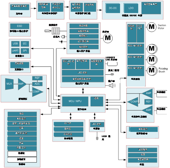 電池壽命和可靠性是真空機器人面臨的兩大設(shè)計挑戰(zhàn)。大多數(shù)真空機器人都是電池供電的,并從電源座充電。真空機器人的典型框圖如圖1所示。