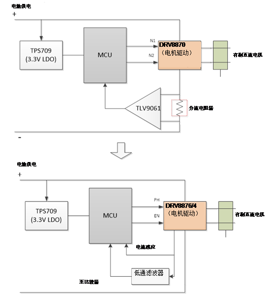 圖3所示為早期一代真空機器人的框圖,其中DRV8870需要外部分流電阻來感應(yīng)電流,而外部放大器則需要向MCU發(fā)送反饋。這需要額外的電路板空間,增加成本,并增加了布線復(fù)雜性和維護(hù)。