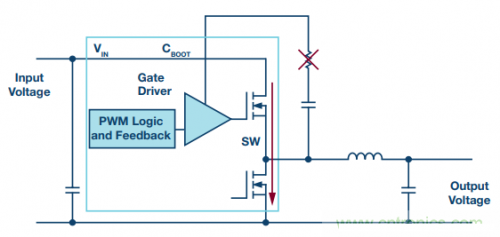 【圖2. 使用自舉電阻減慢異步降壓轉(zhuǎn)換器中的開(kāi)關(guān)轉(zhuǎn)換!