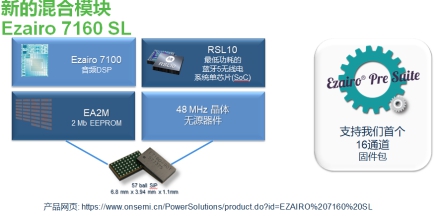 Ezairo 7160 SL是基于DSP的開放式可編程混合模塊,是目前專業(yè)助聽器芯片集成度最高的無線方案,在一個(gè)3.8*6.6mm的小封裝中集成Ezairo 7100 DSP、行業(yè)最低功耗的藍(lán)牙5無線電系統(tǒng)單芯片(SoC) RSL10、2 MB EEPROM(EA2M)和無源器件。