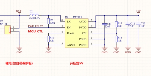 接下來,我們就來看下升壓部分的電路,鋰電池升壓部分筆者采用了一顆型號為KF2185的同步升壓芯片,這款芯片的同步升壓效率最高可達94%,持續(xù)帶載能力可以達到2A以上,可調(diào)節(jié)電壓輸出,外圍電路也是很簡單。