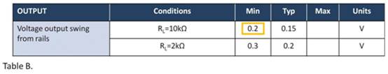 當運算放大器超負荷工作時(形成更大的失調(diào)電壓),輸出擺動更接近軌。有時,我們所列出的輸出擺動會不同于表A。例如,表B的輸出擺動表明了輸入過大的輸出電壓。在我們運算放大器開發(fā)組,它被戲稱為“沖撞規(guī)格”,意思是輸入過大,一路沖撞到軌。
