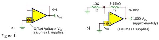 所有人都知道失調(diào)電壓,對吧?在圖 1a 所示最簡單的 G=1 電路中,輸出電壓是運算放大器的失調(diào)電壓。失調(diào)電壓被建模為與一個輸入端串聯(lián)的DC電壓。在單位增益中,G=1 時,失調(diào)電壓直接傳遞至輸出。在右側(cè)高增益電路中,輸出電壓為1000∙Vos,沒錯吧?